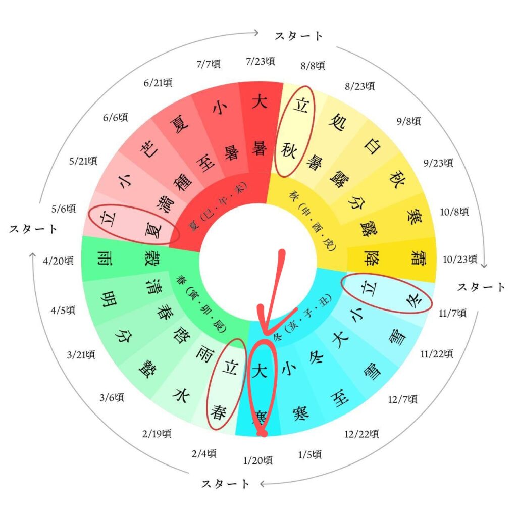 ※四柱推命の季節は、カレンダー上の月ではなく太陽の動き(二十四節気)に基づいています。