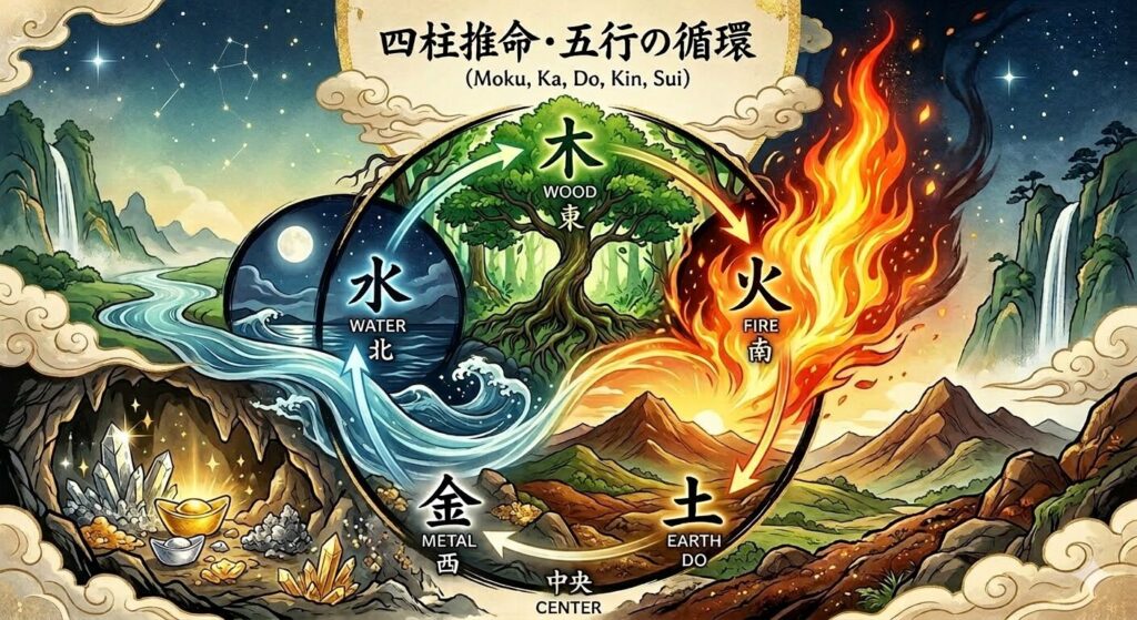 五行の流れは、木(甲/乙) → 火(丙/丁) → 土(戊/己) → 金(庚/辛) → 水(壬/癸)で五行周流しています。